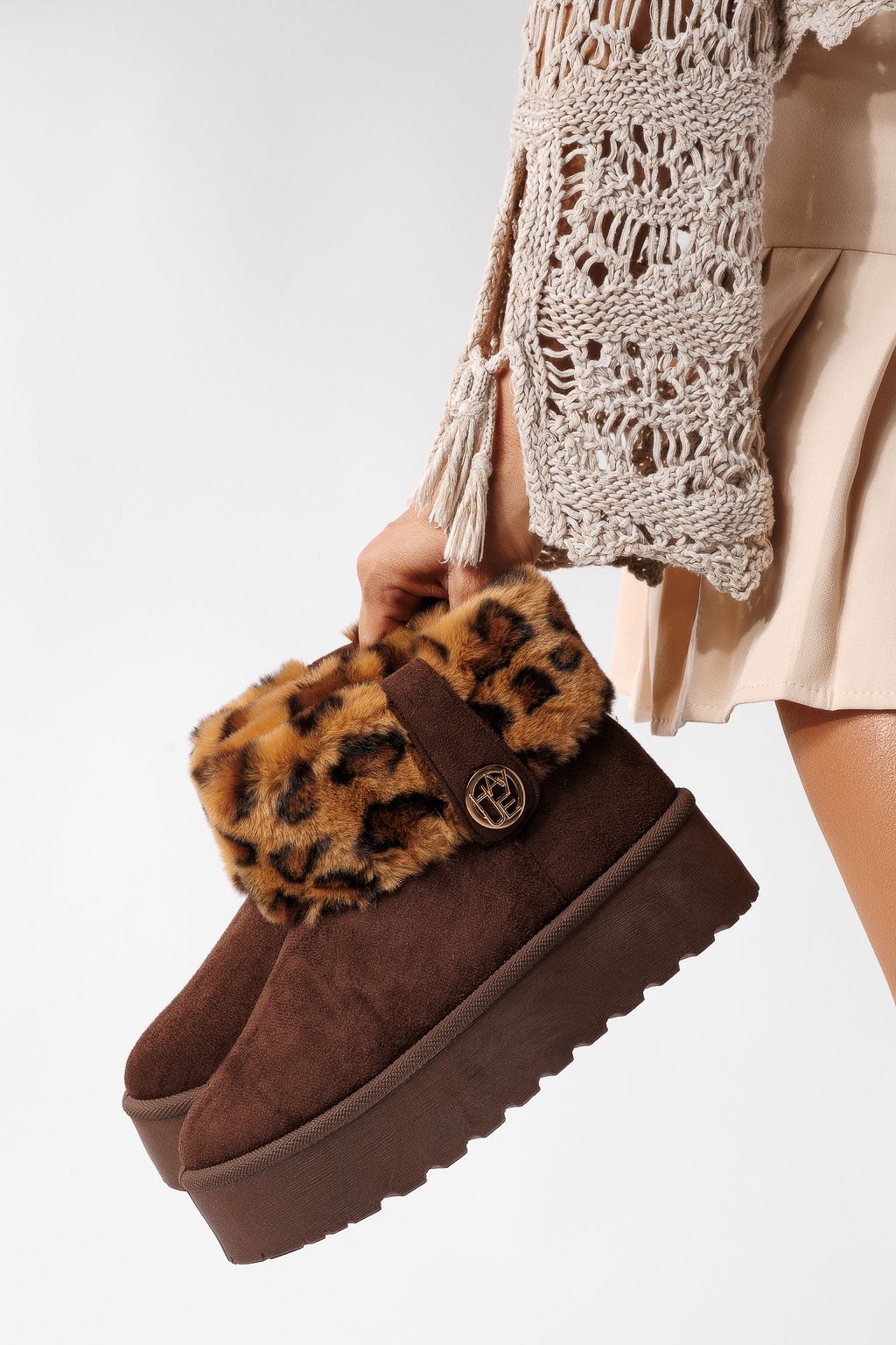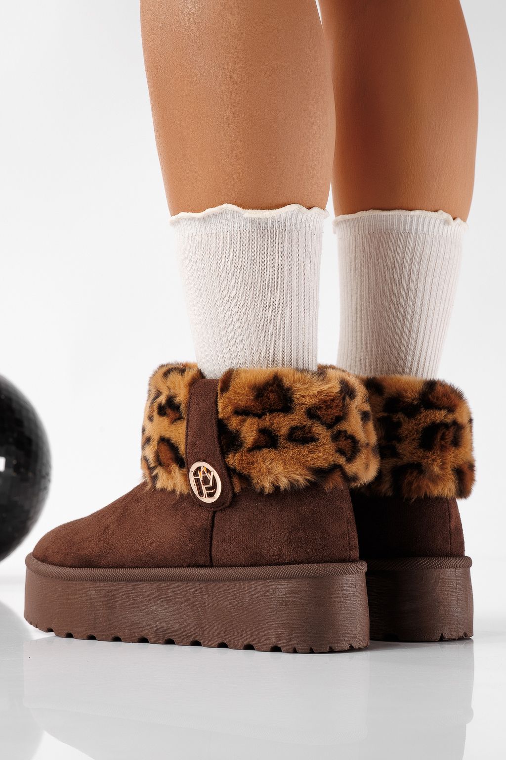 Ниски дамски чизми подплатени с пух тип UGG кафяви от обърната еко кожа Beatrice#22761