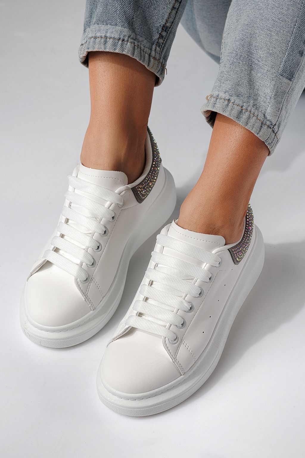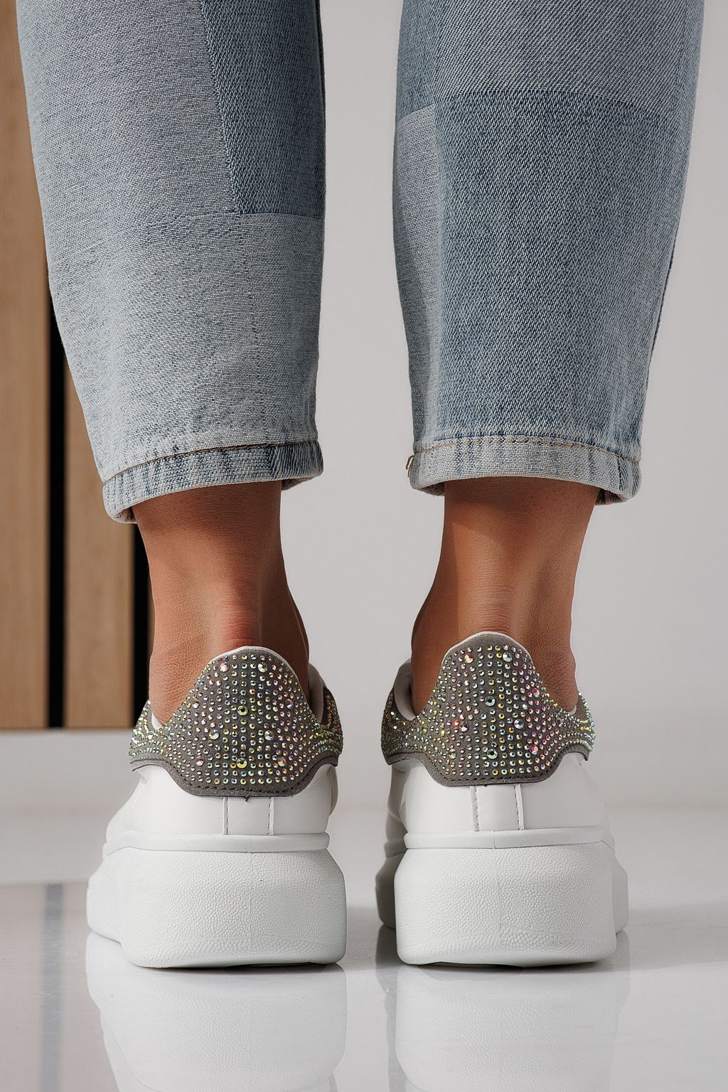 Дамски маратонки бели със сиво от еко кожа Raya #24235